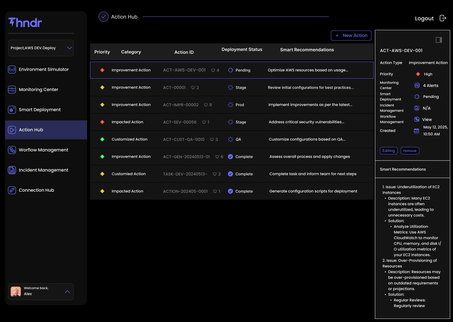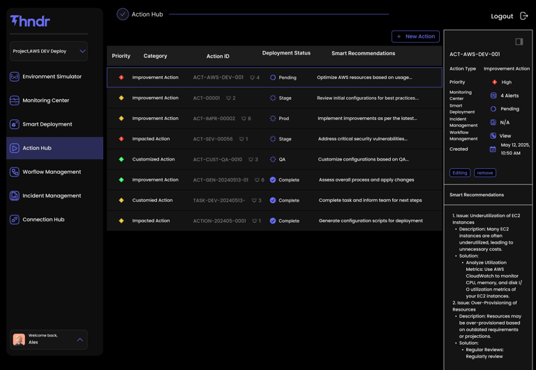 Action Hub is the command center for intelligent, AI-generated remediation and optimization. As the agent continuously monitors your environment, it surfaces smart, context-rich action items based on real-time analysis and best practice checks. Actions are automatically categorized by type: improvement, customized, or critical-impact, and prioritized by severity, security risk, and urgency. Each item includes a tailored explanation, recommended fix, and a prebuilt or customizable workflow. Upon approval, actions can be deployed across dev, QA, staging, or production environments using our agentic CI/CD engine. With deep monitoring integrations and resource-aware orchestration (including Kubernetes-ready node exporters), Action Hub helps teams proactively manage infrastructure, optimize performance, prevent failures, and align with industry standards, all from a single automated interface.